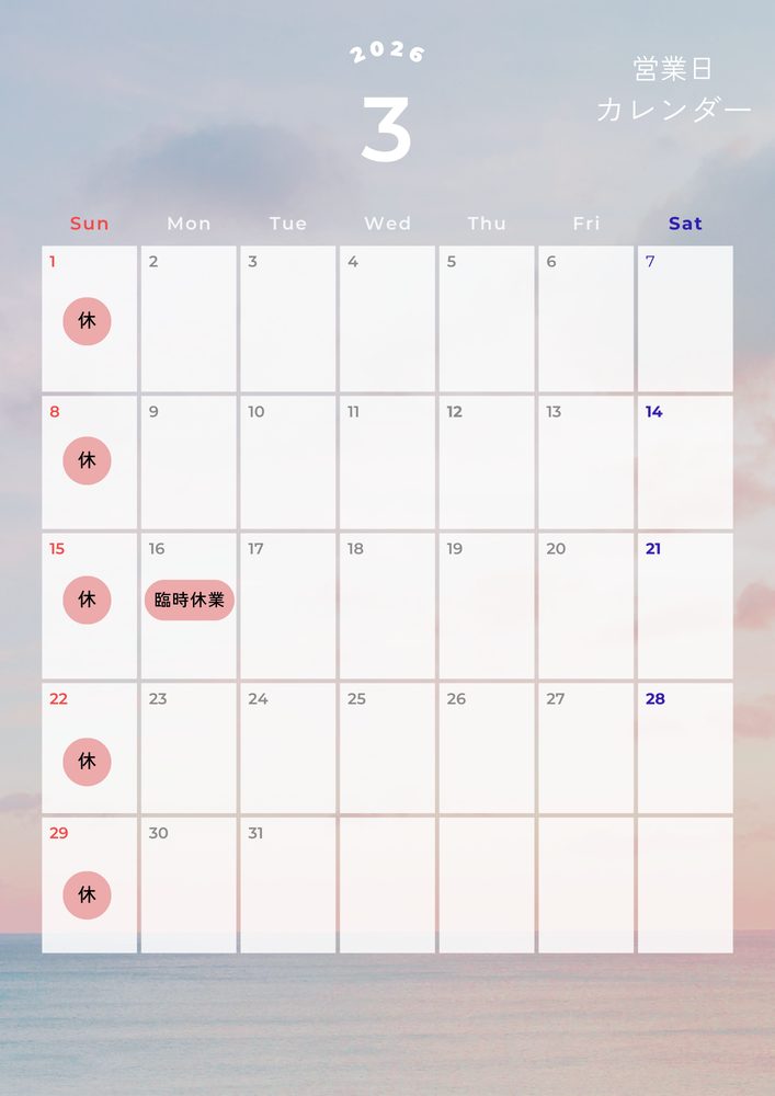 2026.03.05 お知らせ 📅3月営業日のお知らせ📅 3月の営業日とお休みはこちらになります💁♂3/16は臨時休業となります。ご予約は公式ホームページまたはお電話にて承っております🙇♂是非、たくさんのご来店お待ちしております‼⌚営業時間⇒17:30〜23:00🗓定休日⇒日曜/その他不定休🌐予約⇒公式ホームページor電話📍住所⇒三重県松阪市平生町34 PDFはこちら